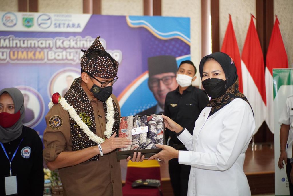 BATU (Realita)- Menteri Pariwisata dan Ekonomi Kreatif (Menparekraf) RI Sandiaga Salahuddin Uno bersama Wali Kota Batu, Dewanti Rumpoko membuka kegiatan Entrepreneur Workshop dan Talkshow Minuman Kekinian yang diselenggarakan di Graha Pancasila, Balaikota Among Tani Kota Batu, Rabu (29/6/2022).