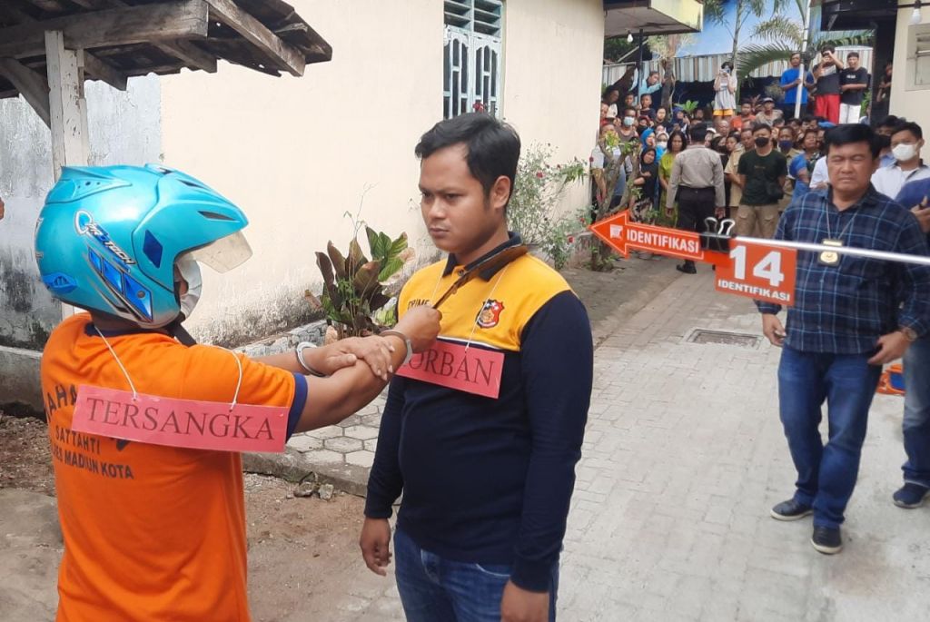 “Rekonstruksi tadi mulai datang, kemudian berhenti di gardu. Lalu satu masuk, satu yang berboncengan juga masuk, dan lainnya menunggu disebelah utara,” kata Kasat Reskrim Polres Madiun Kota, AKP tatar Hernawan, Selasa (5/7/2022).