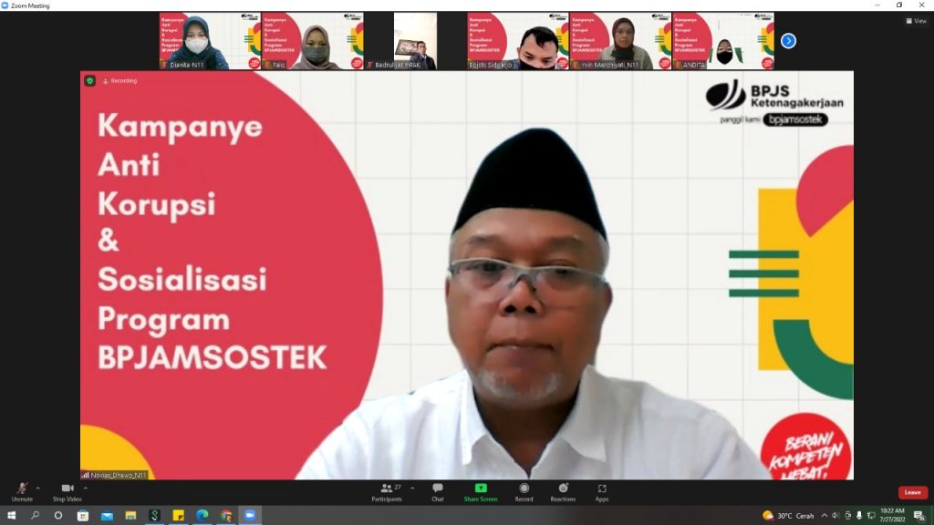 SIDOARJO (Realita) - BPJS Ketenagakerjaan (BPJAMSOSTEK) Sidoarjo menggelar kegiatan sosialisasi bertajuk Kampanye Anti Korupsi dan Sosialisasi Program BPJAMSOSTEK melalui virtual zoom meeting pada para mahasiswa dari berbagai perguruan tinggi dan siswa-siswi peserta magang.