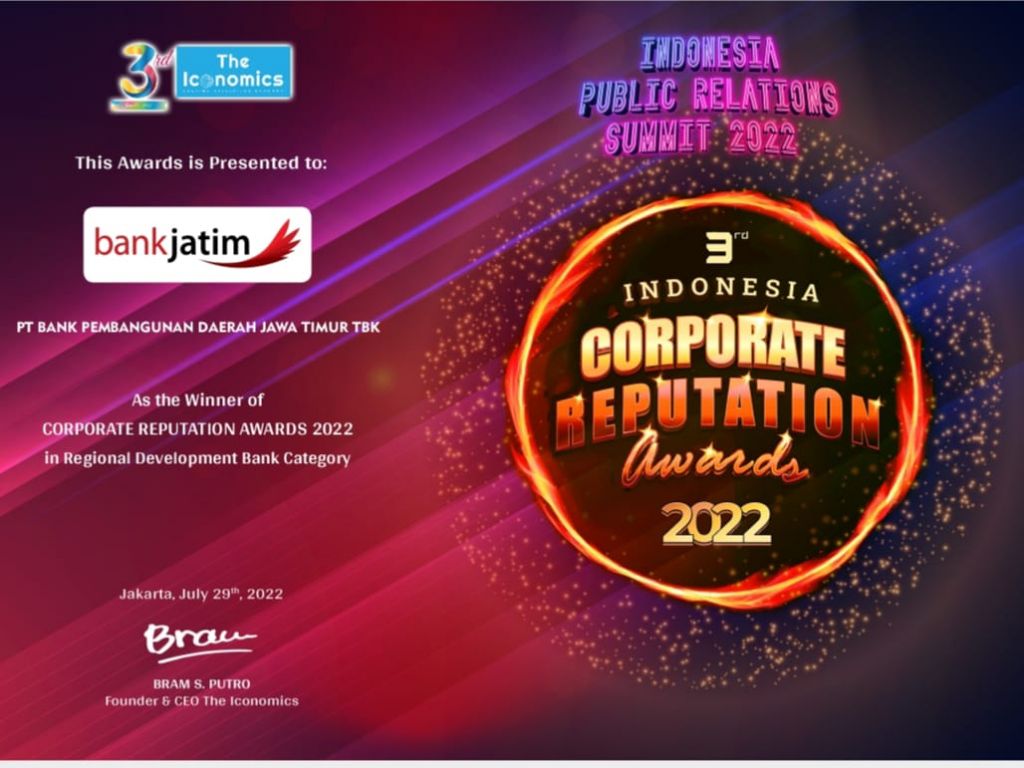 Penilaian reputasi perusahaan tersebut meliputi Business & Commercial Reputation, People & Leadership Reputation, serta Social & Citizenship Reputation. Dengan landasan tersebut, The Iconomics Research & Consulting menetapkan Bank Jatim sebagai penerima penghargaan Corporate Reputation Awards 2022 dalam kategori Bank Daerah.