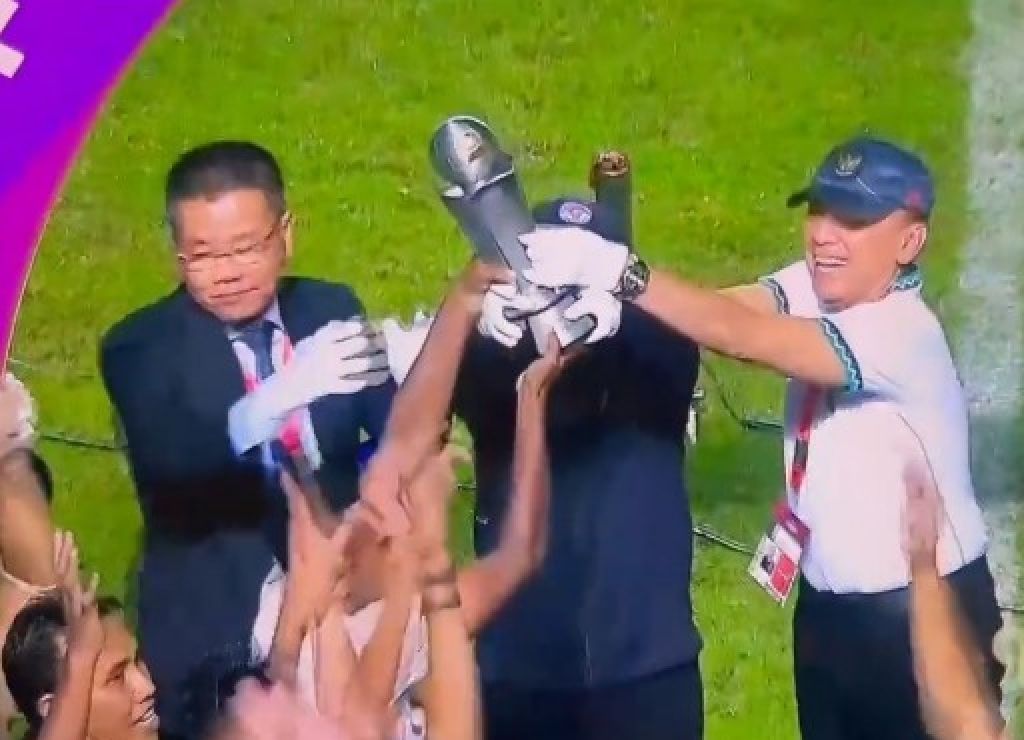 Dalam prosesi angkat piala, ada pemandangan tak biasa. Sebab, bukan hanya anggota Timnas Indonesia U-16 yang memegang trofi.