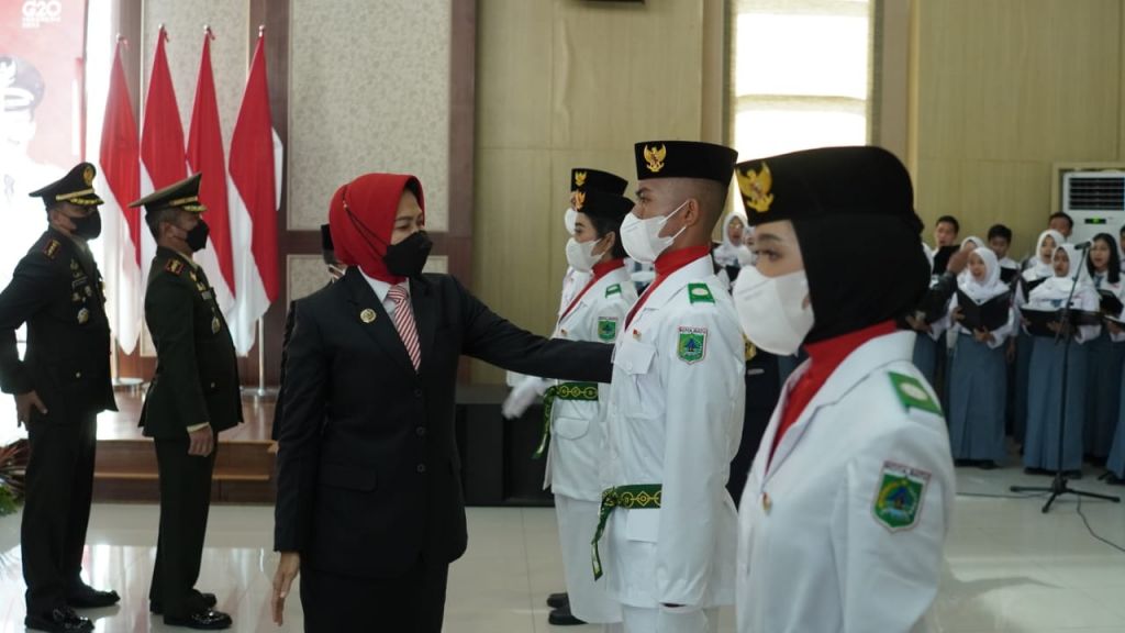 BATU (Realita)- Wali Kota Batu, Hj Dewanti Rumpoko, bertindak sebagai inspektur upacara pada saat pengukuhan Pasukan Pengibar Bendera Pusaka (Paskibraka) Kota Batu Tahun 2022 yang digelar di Graha Pancasila Balaikota Among Tani Kota Batu, Senin(15/08/2022).