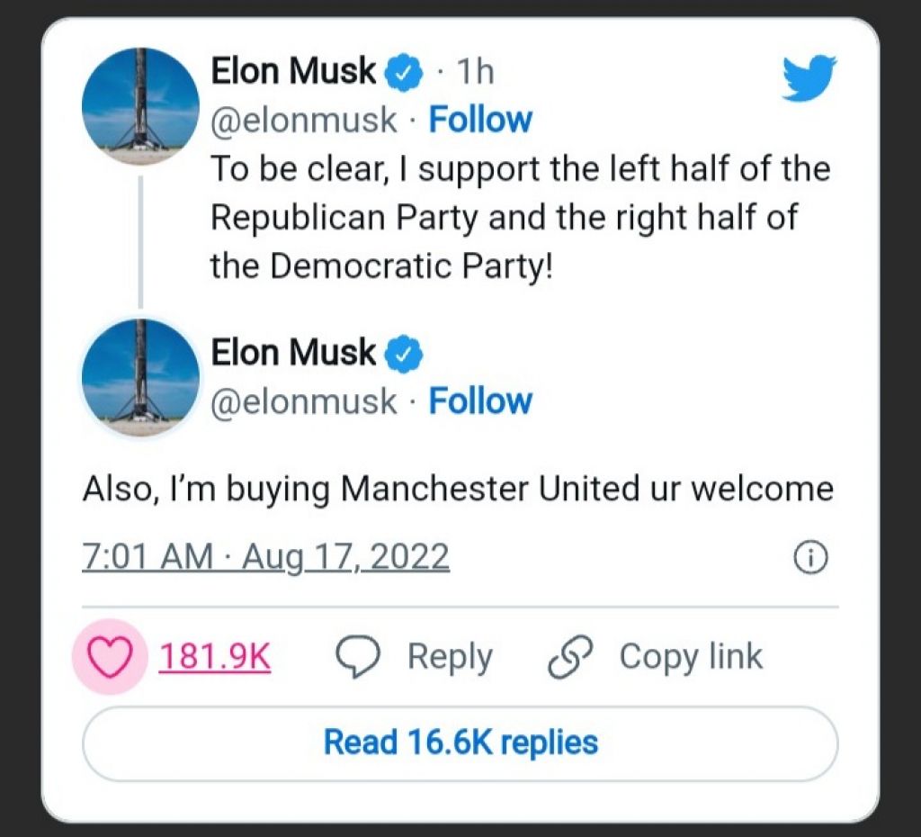 Cuitan Musk soal MU ini merupakan lanjutan dari twit sebelumnya yang menegaskan dukungan pada partai Republik dan Demokrat AS.