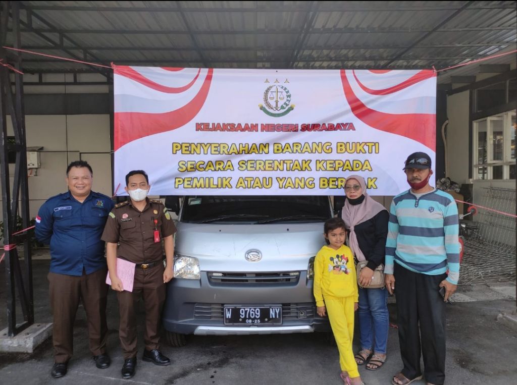 "Barang bukti yang diserahkan langsung oleh Rizal Pradata, SH. Kasi BBBR Kejari Surabaya kepada pemilik tersebut berupa 1 unit mobil, 9 unit motor, 1 unit laptop, 6 buah kartu ATM dan barang bukti lainnya,"katanya falam rilis tertulisnya, Jum'at (19/8/2022).
