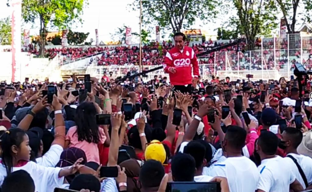 SURABAYA (Realita) - Presiden Joko Widodo (Jokowi) hadir di Surabaya menyapa Relawan Sapulidi Jawa Timur yang tengah menggelar konser '2024 satu komando ikut Pak Jokowi' di Gelora 10 November, Tambaksari, Surabaya, Minggu (21/8/2022).