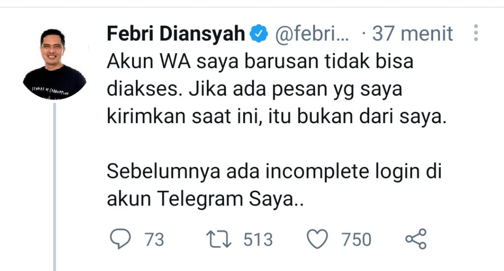 Selain Whatsapp, akun Telegram Febri juga bermasalah. "Sebelumnya ada incomplete login di akun Telegram saya," terangnya.