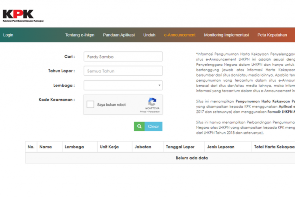 Tertulis "Belum ada data" pada laman elhkpn.kpk.go.id.pas