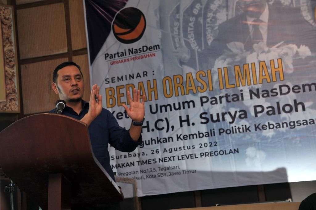 SURABAYA (Realita) - DPW Partai NasDem Jawa Timur menggelar acara seminar : Bedah orasi ilmiah Surya Dharma Paloh 'Meneguhkan Kembali Politik Kebangsaan' di Kota Surabaya.