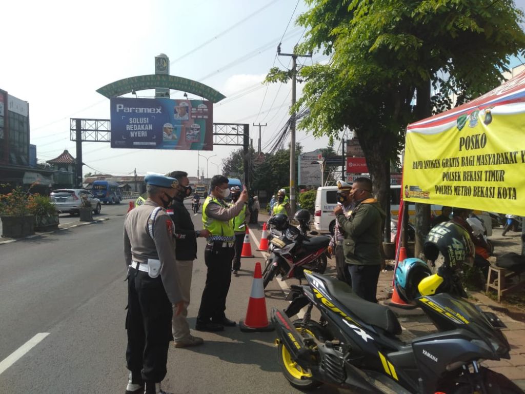 Pengecekan terhadap Pos penyekatan dalam rangka Kegiatan Rutin Yang Ditingkatkan (KRYD) di Wilayah Hukum Polres Metro Bekasi Kota oleh petugas dalam rangka mengurangi penyebaran Covid-19.