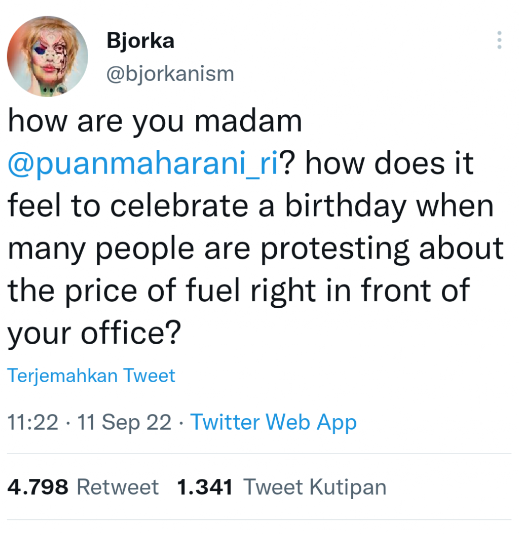 Bjorka menanyakan bagaimana perasaan Puan berulang tahun di tengah protes demo BBM saat itu.