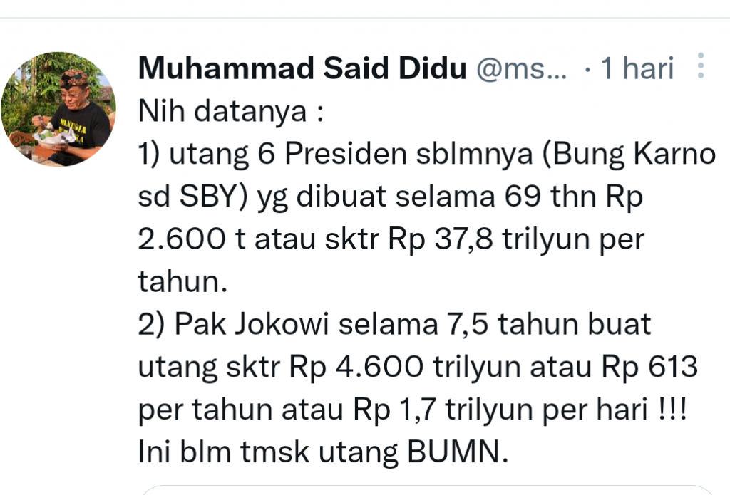 “Tahun 2021 harus bayar utang Rp 902 dan diperkiran anak naik tahun 2022,” demikian cuitan Said Didu.