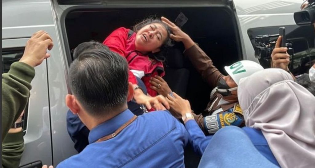 Namun saat sampai di depan mobil tahanan, dia langsung histeris berteriak sambil kakinya menahan masuk ke mobil.