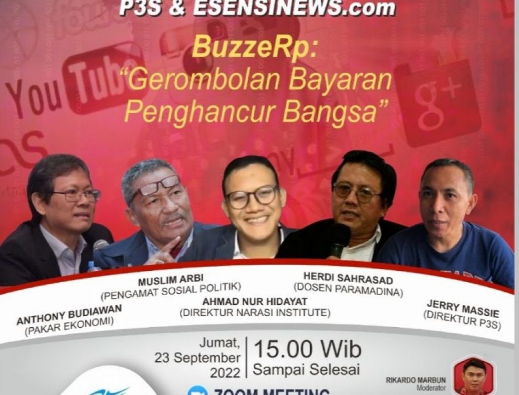 Demikian pandangan mantan aktivis HMI ITB Muslim Arbi, akademisi Universitas Paramadina Herdi Sahrasad dan Direktur PEPS Anthony Budiawan, dalam webinar daring bertema '' BuzzeRp : Gerombolan Bayaran Penghancur Bangsa”, di Jakarta Jumat (23/9/2022).