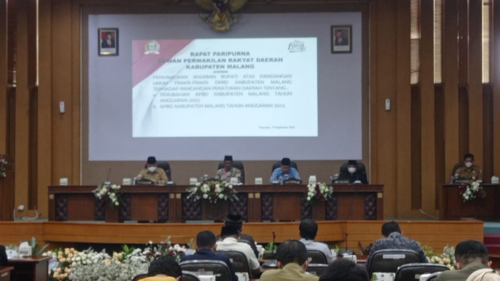 KABUPATEN MALANG (Realita)- Bupati Malang H. M Sanusi menyampaikan jawaban atas pandangan umum fraksi Dewan Perwakilan Rakyat Daerah (DPRD) Kabupaten Malang terhadap dua Rancangan Peraturan Daerah (Ranperda), yaitu Ranperda Perubahan Anggaran Pendapatan dan Belanja Daerah (PAPBD) tahun anggaran 2022 dan Ranperda Anggaran Pendapatan dan Belanja Daerah tahun anggaran 2023. Hal itu disampaikan Bupati Malang saat sidang paripurna di Ruang Sidang Gedung DPRD Kabupaten Malang, Senin (19/09).