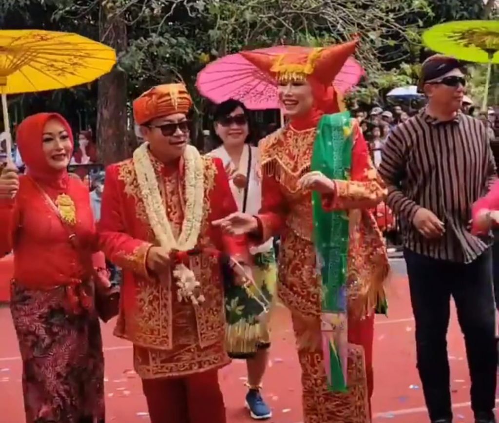 Dengan mengenakan busana daerah Sumatera Barat, Wali Kota Malang, Drs. H. Sutiaji didampingi Ketua TP PKK Kota Malang, Hj Widayati Sutiaji, S.Sos., MM turut langsung memeriahkan gelaran kirab ini.