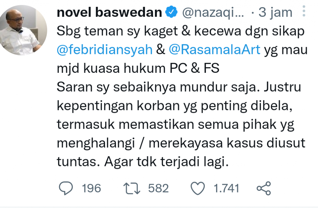 "Sebagai teman saya kaget & kecewa dengan sikap @febridiansyah & @RasamalaArt yang mau menjadi kuasa hukum PC & FS," kata Novel.
