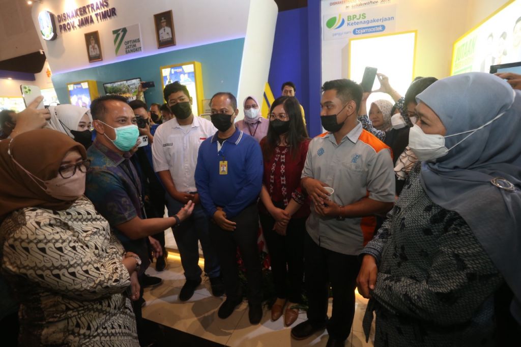 Gubernur Khofifah, ketika mengunjungi Booth BPJS Ketenagakerjaan, kepada Deny Yusyulian selaku Deputi Direktur Wilayah BPJS Ketenagakerjaan Jawa Timur menyampaikan dukungannya terhadap pelaksanaan jaminan sosial ketenagakerjaan bagi setiap pekerja termasuk disabilitas.