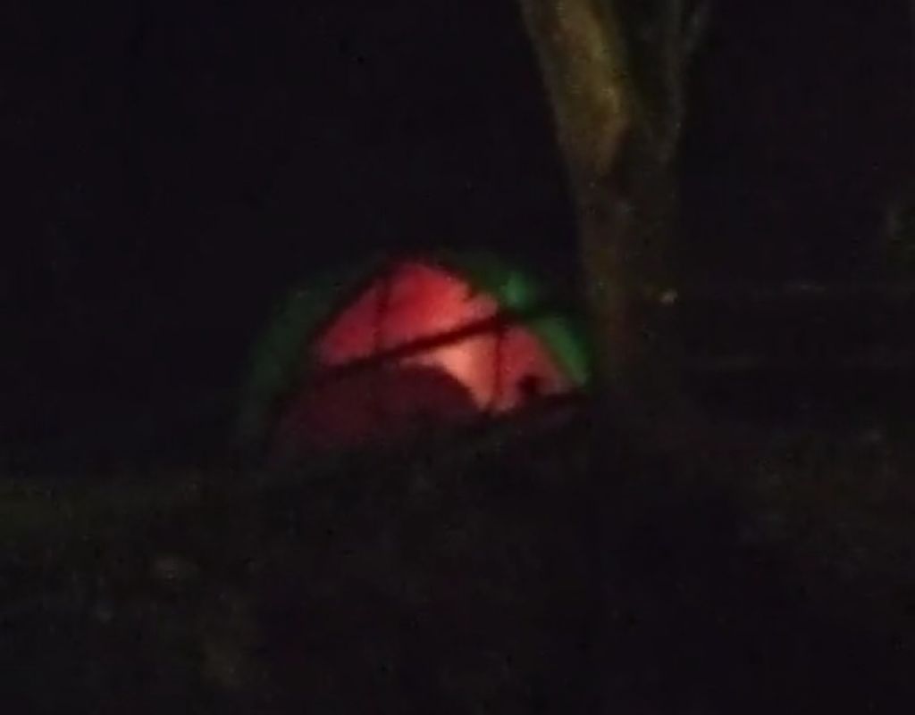 Tampak pada video, dalam tenda berwarna oranye dengan list hijau itu ada orang yang sedang melakukan aktifitas.
