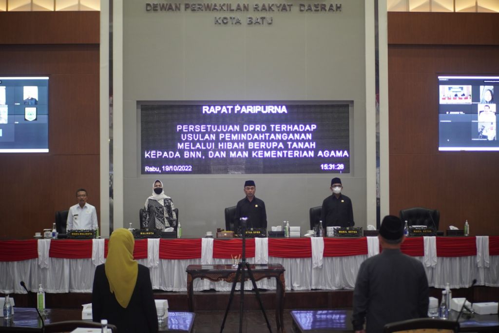 BATU (Realita)- Rapat Paripurna DPRD Kota Batu terkait pemidahtanganan melalui hibah dua aset tanah yang berada di Jalan Sultan Hasan Halim, Kelurahan Sisir kepada BNN dan aset tanah bangunan MAN Kota Batu yang berada di Jalan Patimura Kelurahan Temas kepada Kemenag telah disetujui Dewan Perwakilan Rakyat Daerah (DPRD) Kota Batu.