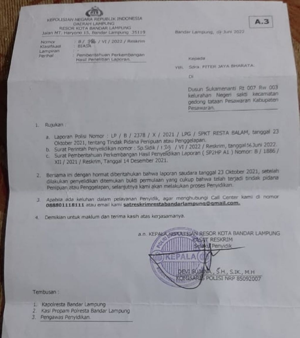 BANDAR LAMPUNG (Realita)- Fiter (32) Kecewa pada petugas Polresta Bandar Lampung. Pasalnya, laporannya Nomor : LP/B/2378/X/2021/SPKT/POLRESTA BANDAR LAMPUNG POLDA LAMPUNG, tanggal 23 Oktober 2021, mengenai perkara tipu gelap yang dilakukan oleh oknum pengacara di Bandar Lampung, belum ada progress berarti.