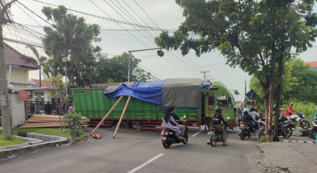 Hingga berita ini diunggah, truk masih melintang menutup jalan dan sopir truk dan beberapa pria lain, tampak sibuk menurunkan muatan kayunya.ika