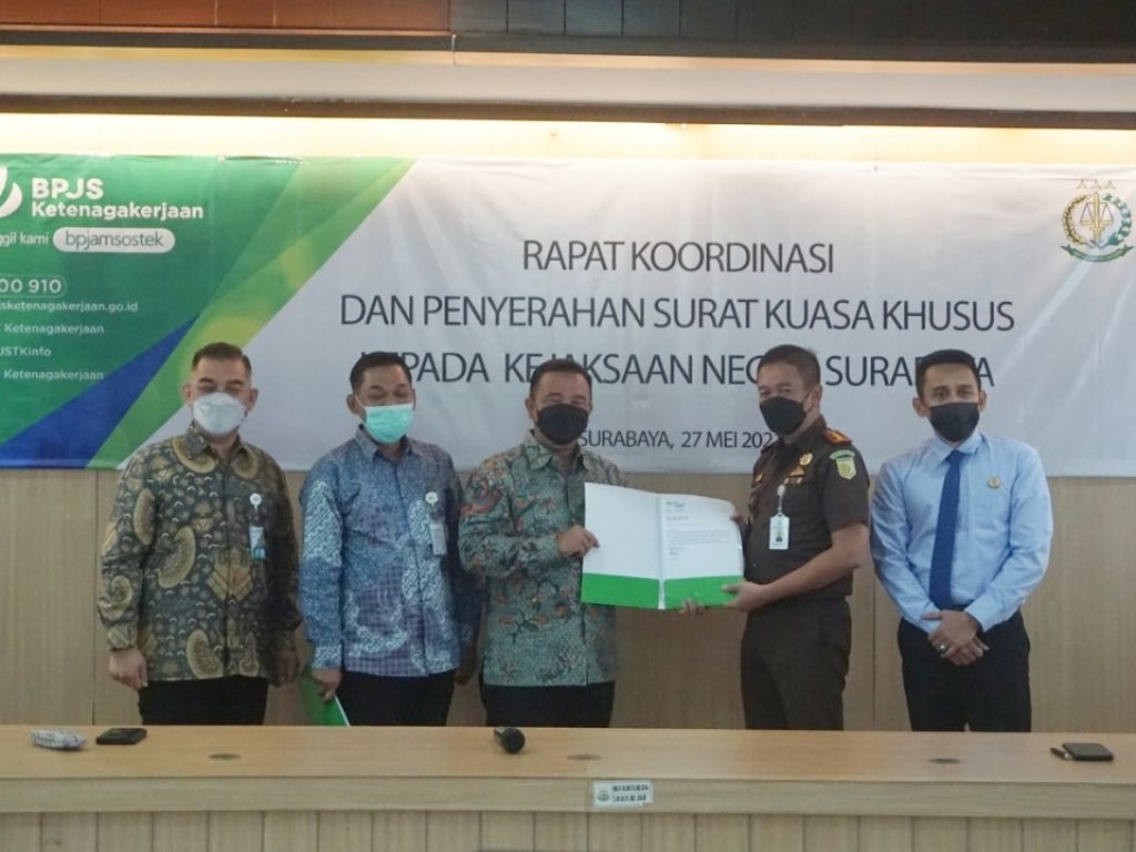 SURABAYA (Realita)-Menindaklanjuti banyaknya perusahaan yang masih menunggak iuran, Badan Penyelenggara Jaminan Sosial (BPJS) Ketenagakerjaan Surabaya Darmo menyerahkan Surat Kuasa Khusus (SKK) kepada Kejaksaan Negeri (Kejari) Surabaya, Kamis (27/5/2021).