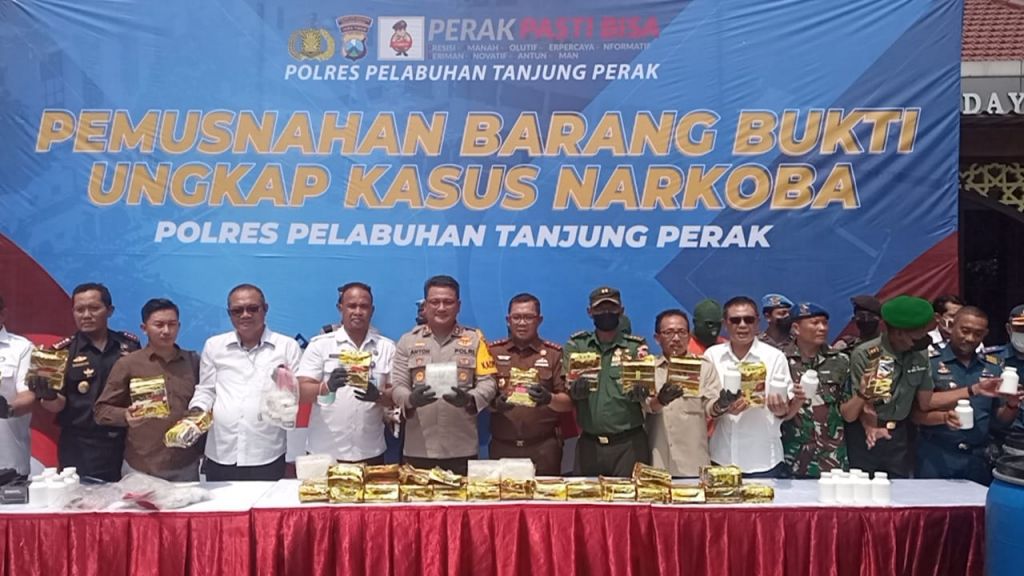 Kapolres Tanjung Perak AKBP Anton Elfrino mengatakan, dari ungkap narkoba jaringan internasional ini, anggota berhasil amankan sabu, ekstasi dan obat keras atau pil koplo ada yang double L sejak bulan Agustus 2022 lalu.