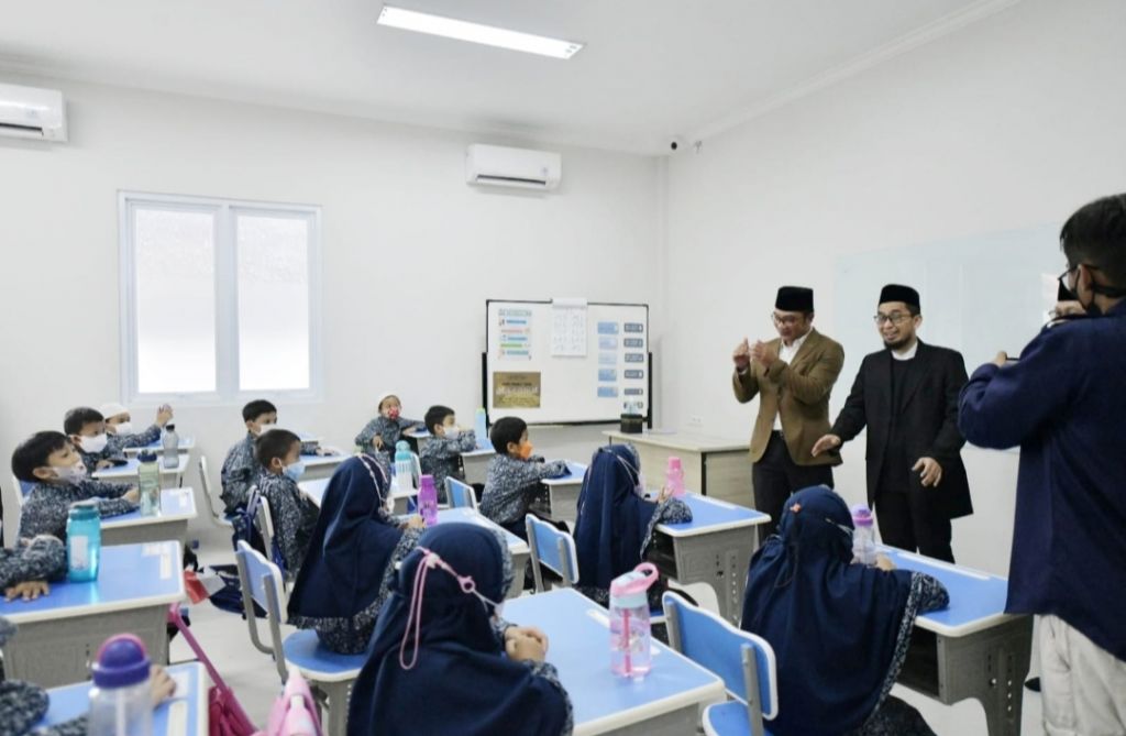 KOTA BEKASI (Realita)- Gubernur Jawa Barat Ridwan Kamil bersama Menteri Perdagangan Zulkifli Hasan meresmikan operasional gedung Sekolah Dasar Akhyar International Islamic School, di komplek Greenview Jaka Setia, Bekasi Selatan, Kota Bekasi, Kamis (1/9/2022).