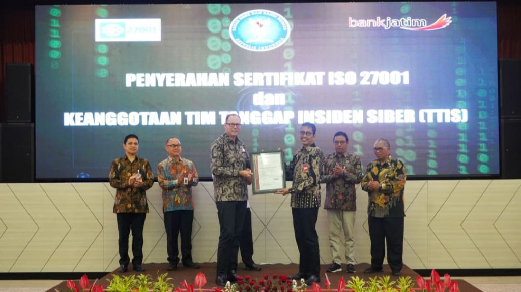 SURABAYA (Realita) - Bertepatan Hari Pahlawan Nasional 10 November 2022, PT Bank Pembangunan Daerah Jawa Timur Tbk (Bank Jatim) menerima penyerahan Sertifikasi ISO 27001:2013, dan Tim Tanggap Insiden Siber (TTIS/CSIRT).