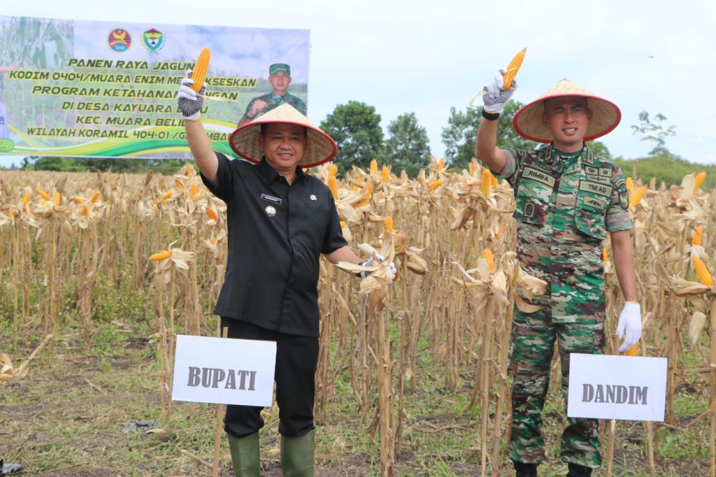 MUARA ENIM (Realita) - Pj. Bupati Muara Enim Kurniawan, AP., M.Si.,bersama Komandan Kodim 0404 Muara Enim Letkol. Arh. Rimba Anwar, S.I.P., M.I.P., melakukan panen raya jagung hibrida inisiasi Kodim 0404 Muara Enim melalui program ketahan pangan di Desa Kayuara Batu, Kecamatan Muara Belida, Jumat (18/11).