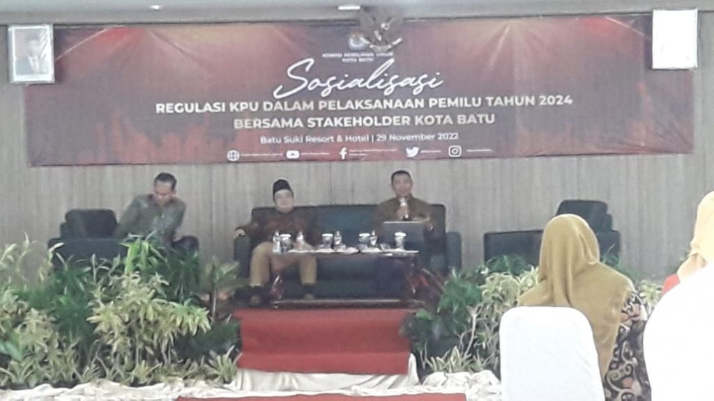 BATU (Realita)- KPU Kota Batu mengadakan sosialisasi terkait regulasi KPU dalam pelaksanaan pemilu tahun 2024 bersama stakeholder Kota Batu, yang berlangsung di salah satu hotel di Kota Batu, Selasa (29/11/2022) siang.