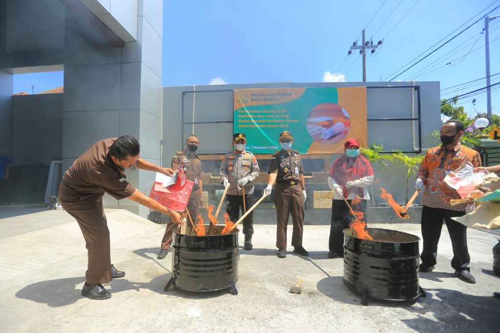MADIUN (Realita) – Barang bukti (BB) narkotika hasil kejahatan selama tahun 2021 dan 2022 dimusnahkan Kejaksaan Negeri (Kejari) Kota Madiun bersama forkopimda dihalaman Kantor Kejari setempat, Kamis (1/12/2022).