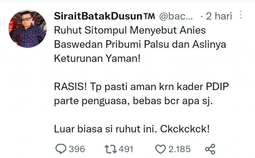 "Ruhut Sitompul Menyebut Anies Baswedan Pribumi Palsu dan Aslinya Keturunan Yaman! RASIS! Tp pasti aman krn kader PDIP parte penguasa, bebas bcr apa sj. Luar biasa si ruhut ini. Ckckckck!," ujar Bachrum Achmadi dikutip NewsWorthy dari akun Twitter pribadi miliknya, Selasa (20/12).