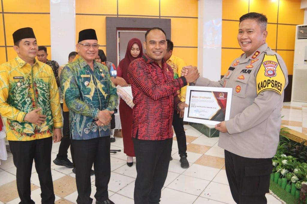 KOTABARU (Realita) - Ketua DPRD secara simbolis menyerahkan piagam penghargaan kepada Kapolres diruang Rapat Sekdakab Kotabaru, Kamis (29/12/2022).