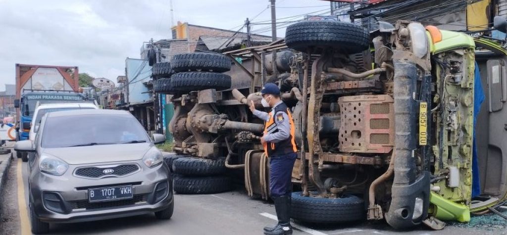 Menurut keterangan saksi mata, ban sisi kanan truk menabrak trotoar ahirnya terguling sampai menutupi sebagian badan jalan.