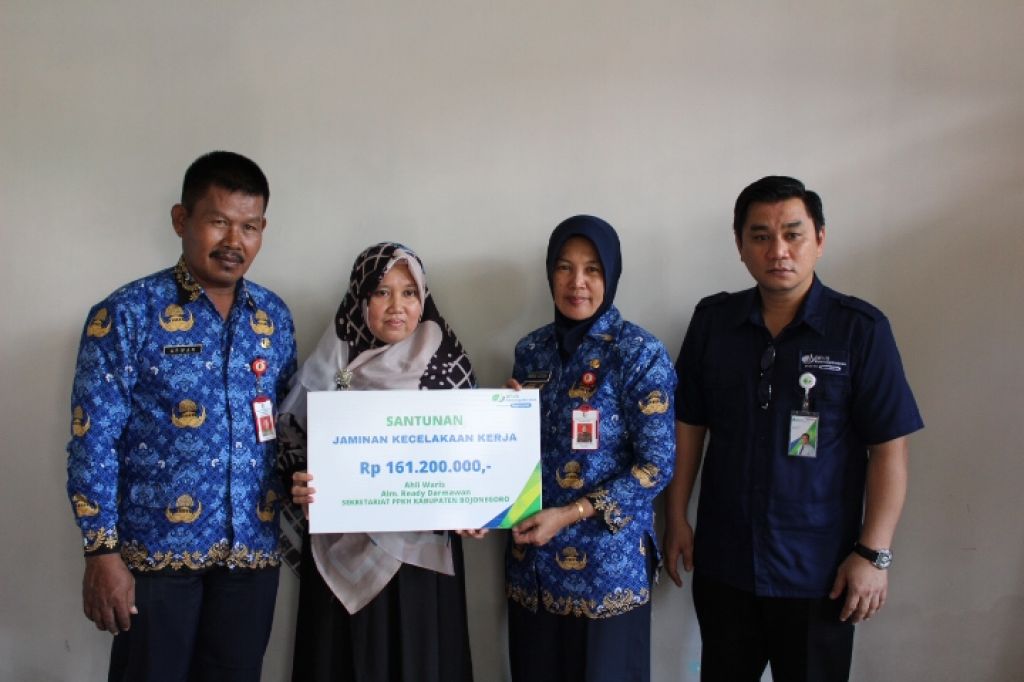 Manfaat program Jaminan Kecelakaan Kerja (JKK) BPJS Ketenagakerjaan sebesar Rp161.200.000,- itu diserahkan Sekretaris Daerah Kabupaten Bojonegoro Nurul Azizah bersama Kepala Dinas Sosial Kabupaten Bojonegoro Drs Arwan dan Kepala BPJS Ketenagakerjaan Cabang Bojonegoro Iman M Amin.
