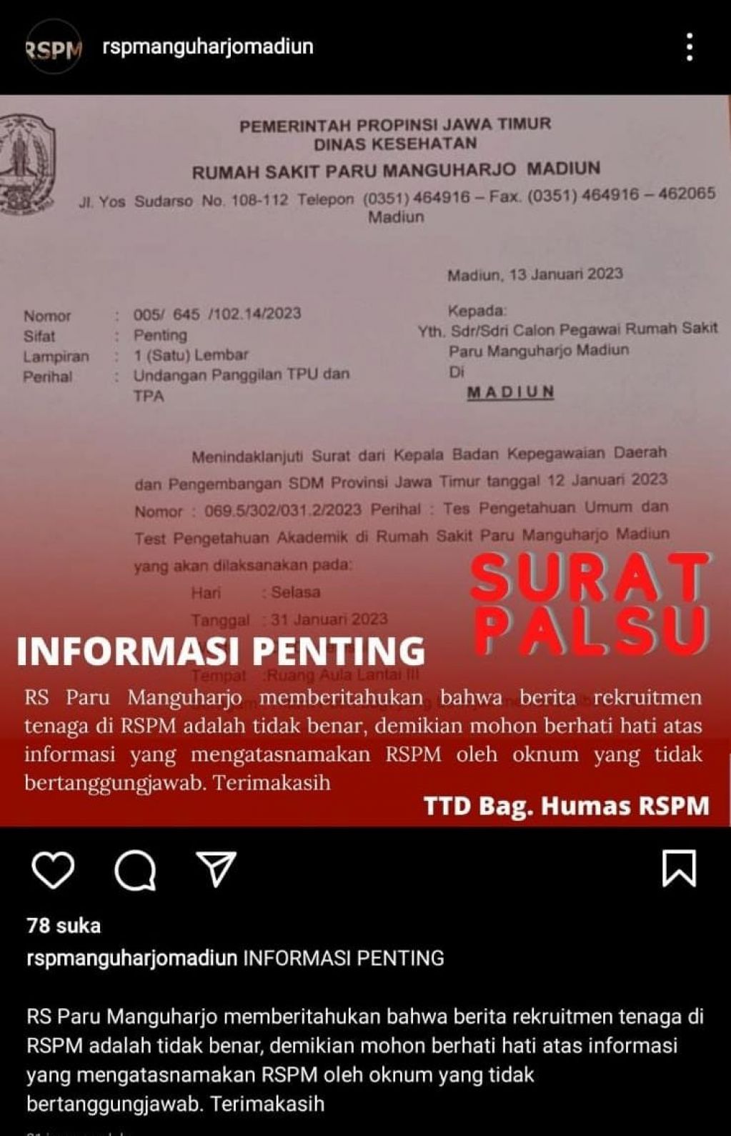 Dalam postingan tersebut, Bagian Humas RSPM juga memberikan keterangan bahwa surat itu palsu. Pun, terdapat tulisan jika berita rekruitmen tenaga di RSPM tidak benar. Sehingga mengimbau kepada masyarakat untuk berhati-hati jika ada yang mengatasnamakan RSPM.