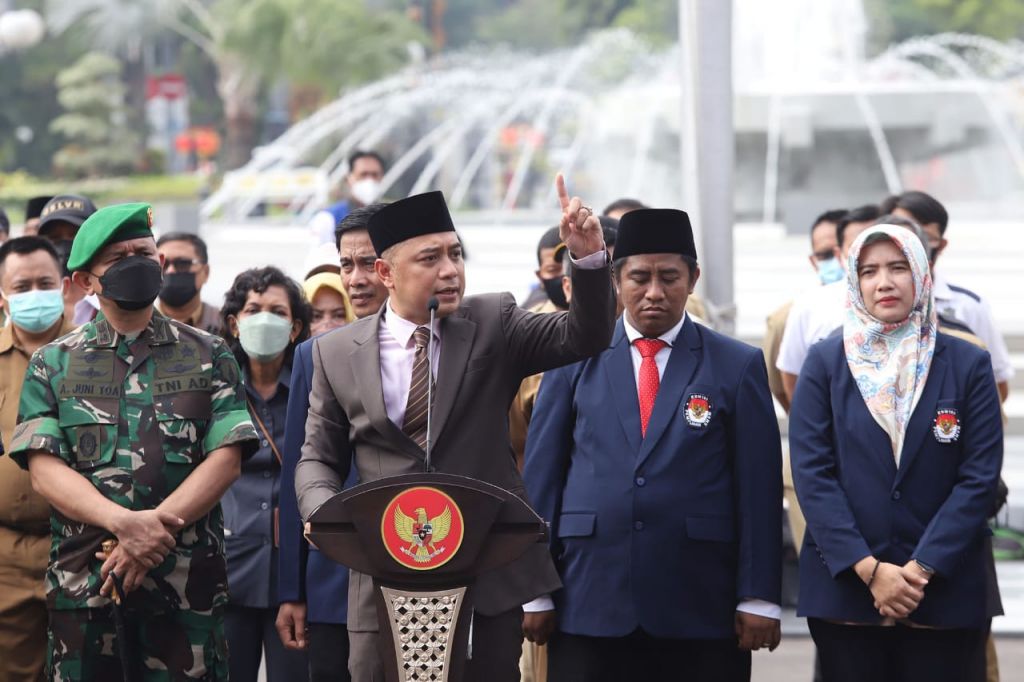 Hal ini disampaikan oleh Wali Kota Eri seusai upacara Pelantikan dan Pengucapan Sumpah/Janji Anggota Panitia Pemungutan Suara untuk Pemilu tahun 2024, yang terdiri anggota Panitia Pemungutan Suara (PPS) dan Panitia Pemilihan Kecamatan (PPK) Komisi Pemilihan Umum (KPU) Kota Surabaya di Halaman Balai Kota, Selasa (24/1/2023).