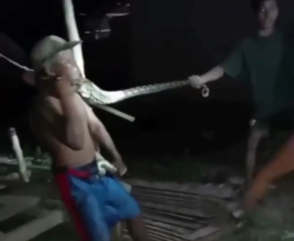 BONE- IK warga Dusun 3, Desa Waluhu, Kecamatan Bone, Kabupaten Bone Bolango, Sulawesi Selatan, seorang pria baruh baya tampak bertelanjang dada dan hanya mengenakan celana kolor warna biru merah menahan sakit dan juga kesulitan bernafas karena ular piton membelit lehernya. Peristiwa itu terjadi pada Selasa (17/1/2023) pukul 22.30 WITA.