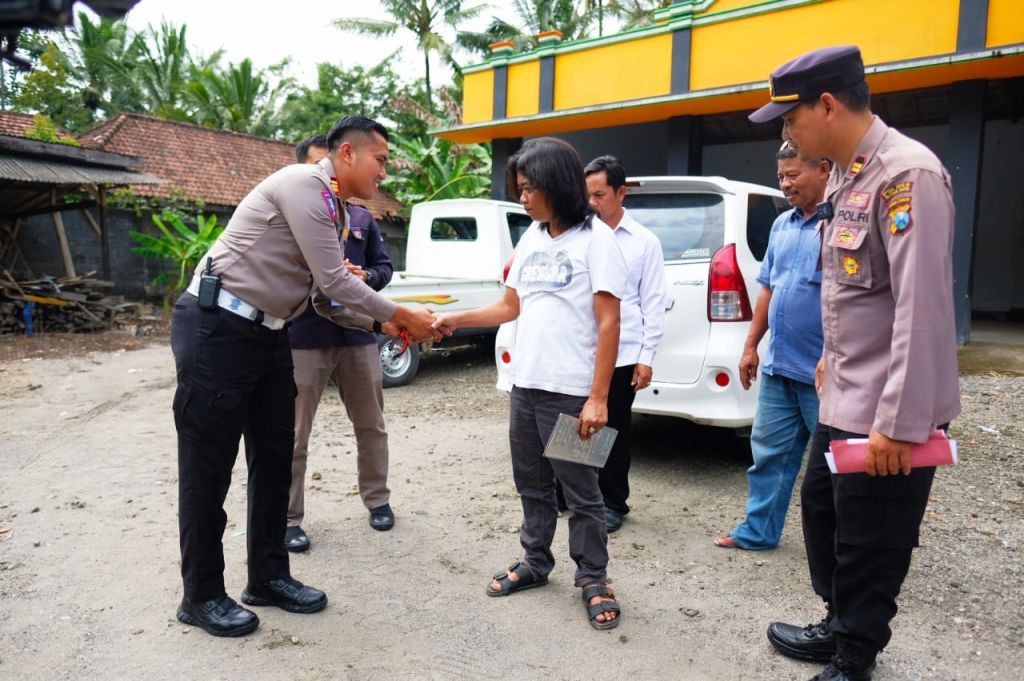 Kapolsek Nglegok bersama Kasat Lantas AKP Mulya Sugiharto dan Kasihumas AKP Rochan langsung menyerahkan mobil kepada korban.