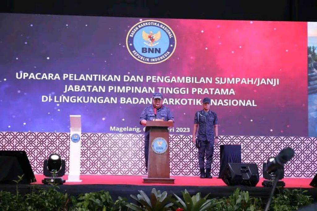MAGELANG - Mengawali rangkaian kegiatan Musyawarah Perencanaan BNN RI tahun 2023, Kepala BNN RI memimpin secara langsung Upacara Pelantikan dan Pengambilan Sumpah/Janji Pimpinan Tinggi Pratama di Lingkungan BNN RI di Hotel Grand Artos Magelang, pada Senin (6/2/2023).