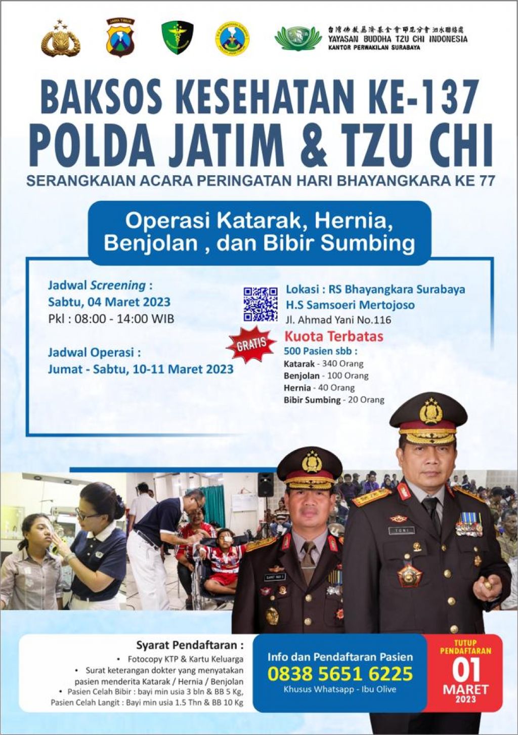 "Baksos Kesehatan ini gratis untuk operasi katarak, hernia, benjolan dan bibir sumbing," kata Kombes Erwin Zainul Hakim, Senin (6/2/2023).