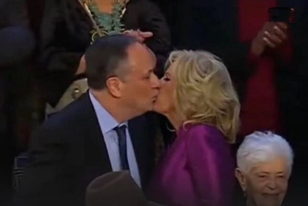 Bukan di pipi, ciuman itu antara Emhoff dan Jill terlihat menyentuh bagian dari bibir.