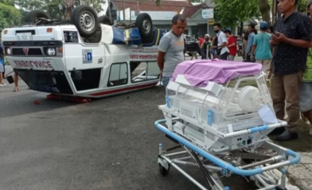 CIAMIS- Sebuah mobil ambulans milik RS Dadi Keluarga yang membawa bayi usia 3 hari dalam inkubator terbalik usai tertabrak truk boks. Insiden terbaliknya mobil ambulans itu terjadi di Simpang empat Tonjong Jalan Jendral Sudirman Ciamis, Kamis (23/2/2023) pukul 09.15 WIB.