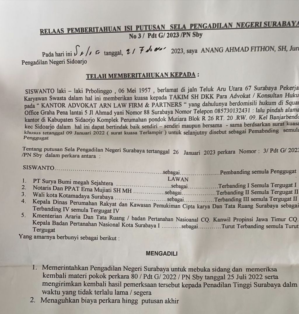 Padahal sebelumnya, gugatan Siswanto ke Pengadilan Negeri Surabaya dengan Nomor Perkara 80/Pdt.G/2022/PN.Sby, yang telah diajukan secara E-Court Mahkamah Agung pada tanggal 21 Januari 2022, dieksepsi oleh PT Surya Bumimegah Sejahtera dan pada tanggal 25 Juli 2022 ini. Dan parahnya, eksepsi tersebut dikabulkan oleh Majelis Hakim Pengadilan Negeri Surabaya.