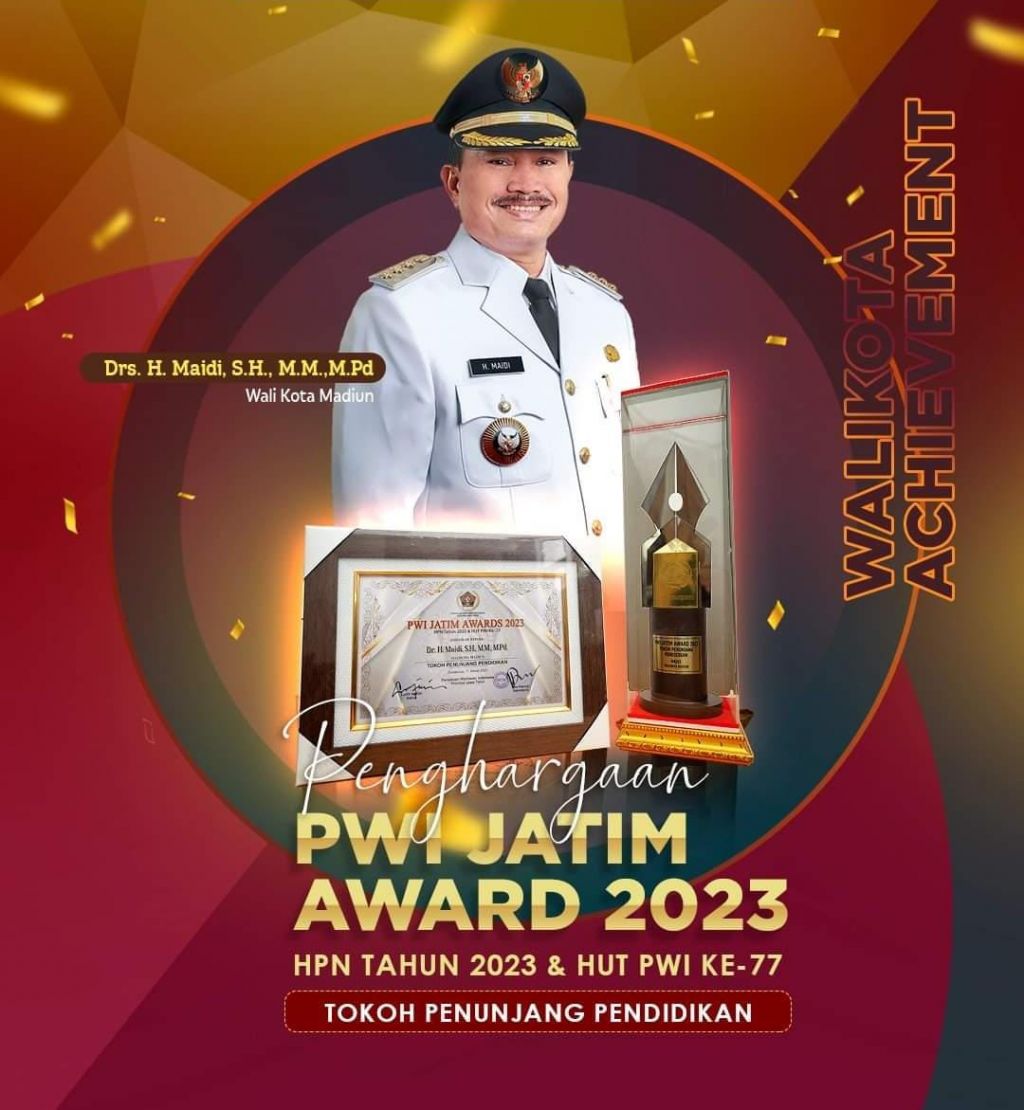 MADIUN (Realita) - WalikotaMadiun, Maidi kembali meraih penghargaan. Kali ini, orang nomor satu di KotaPendekar tersebut, dianugerahi Persatuan Wartawan Indonesia (PWI) Jawa Timur Award 2023 sebagai tokoh penunjang pendidikan.