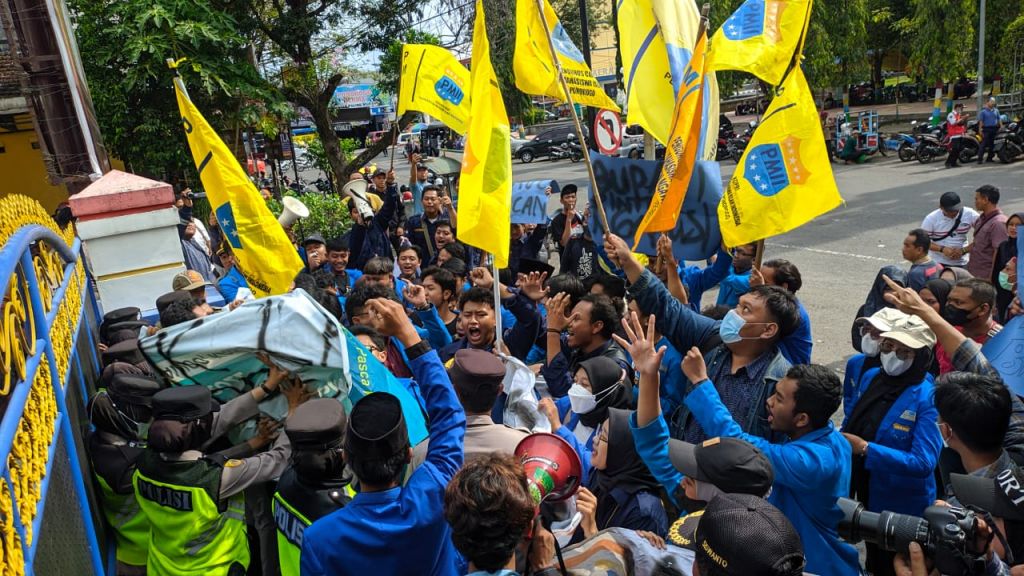 PONOROGO (Realita)- Aksi unjuk rasa terkait penyelesaian masalah sampah di Tempat Pembuangan Akhir (TPA) Mrican Kecamatan Jenangan kembali terjadi. Kali ini, Puluhan mahasiswa yang tergabung dalam Persatuan Mahasiswa Islam Indonesia (PMII), dan Gabungan Kelompok Tani (Gapoktan) Desa Mrican melurug kantor Dewan Perwakilan Rakyat Daerah (DPRD) dan Pemerintah Kabupaten (Pemkab) Ponorogo, Senin (20/03/2023).