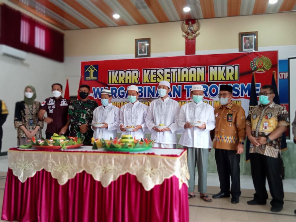 MADIUN (Realita) - Empat orang narapidana terorisme (Napiter) di Lapas Kelas I Madiun kembali ke Negara Kesatuan Republik Indonesia (NKRI). Hal itu dibuktikan dengan pengucapan ikrar setia kepada NKRI yang berlangsung di aula Lapas Kelas I Madiun, Jumat (11/6/2021).