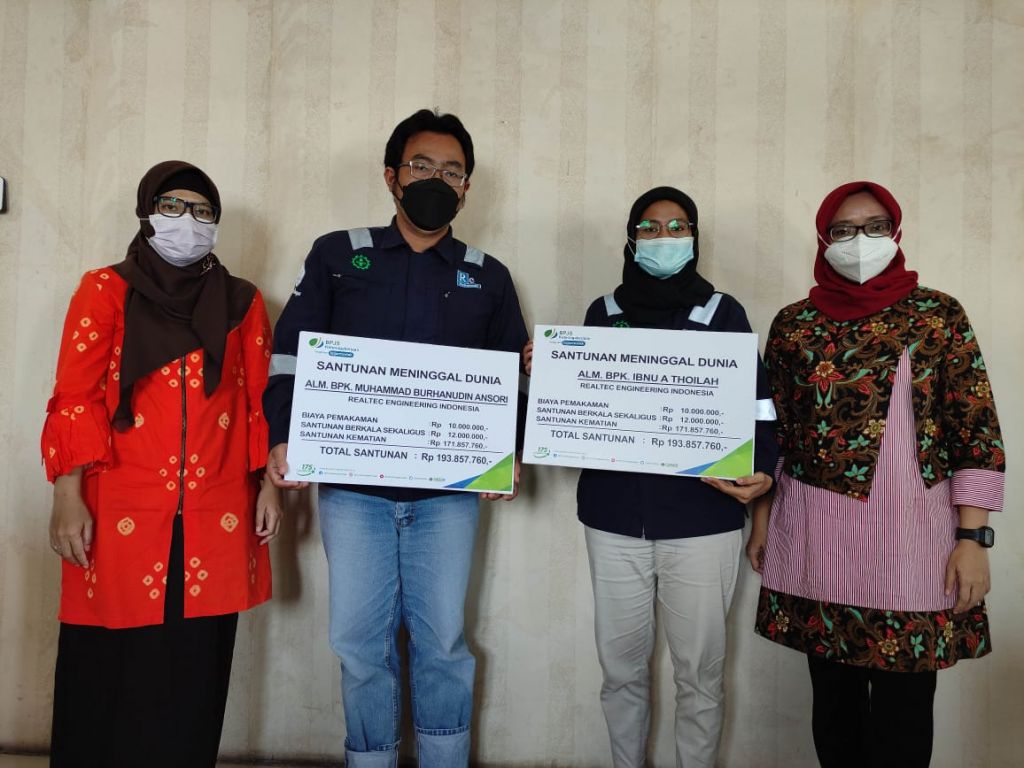 Santunan Jaminan Kecelakaan Kerja (JKK) Meninggal beserta Jaminan Hari Tua (JHT) itu diserahkan kepada ahli waris Almarhum Muhammad Burhanudin Ansori dan Almarhum Ibnu A.Thoilah di Kantor Realtec Engineering Indonesia, Kamis (10/6/2021).