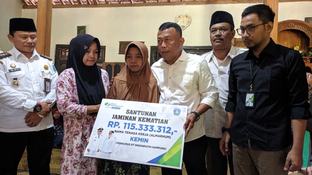 Santunan Jaminan Kecelakaan Kerja dan Jaminan Kematian sebesar Rp 115.333.312 diberikan BPJS Ketenagakerjaan Cabang Ponorogo, kepada ahli waris Almarhum Kemin ( 62) Ketua RT 03 RW 01 Dukuh Gunungan Desa Ringinputih Kecamatan Sampung, yang meninggal usai terjatuh dari genting rumah warga saat kerja bakti membongkar atap Maret lalu.